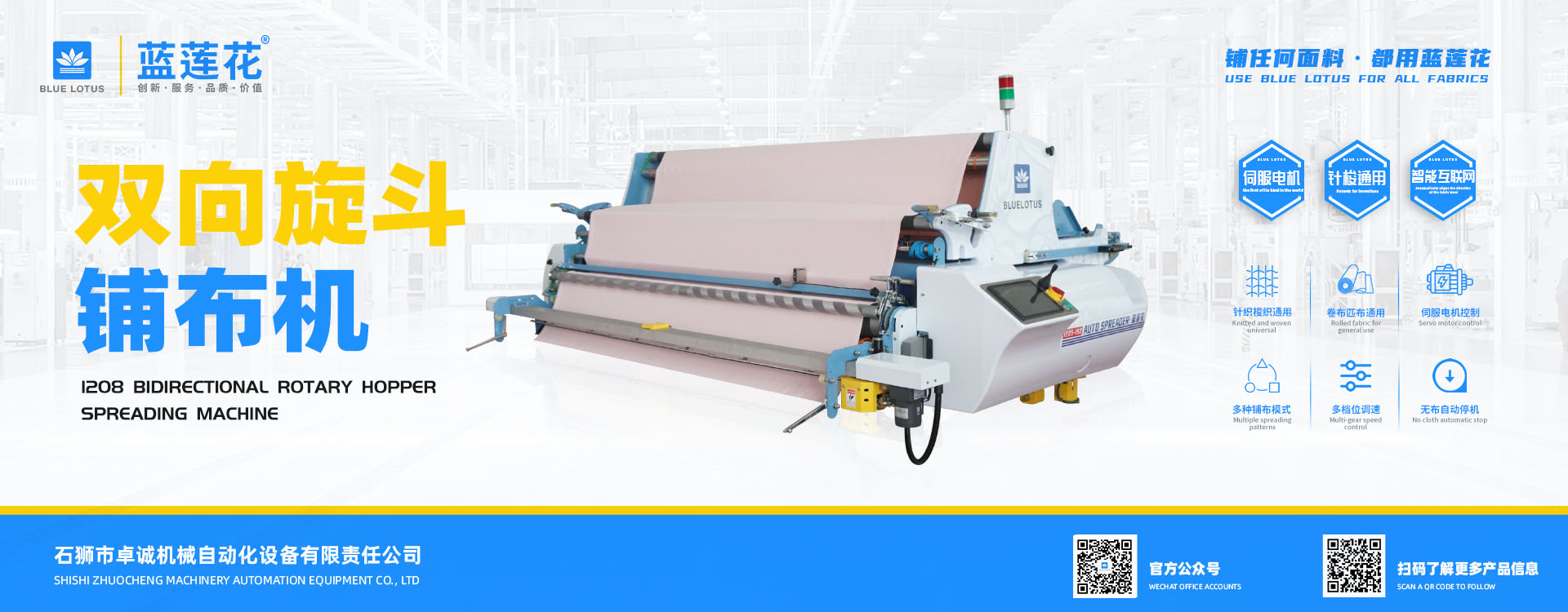 我司結合市場自主研發的藍蓮花品牌拉布機擁有多項專利技術,機器以小巧多功能易操作低維護為特點,為業界提供性價比機型;藍蓮花品牌拉布機以實 用質優為特點自投產以來便在國內贏得市場廣泛認可。